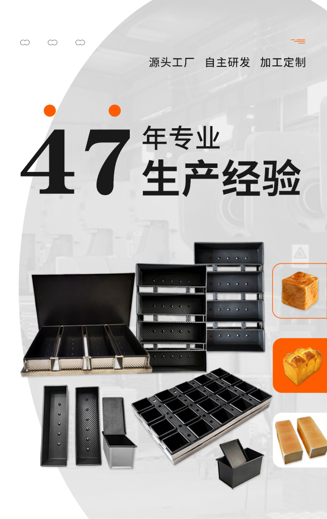 主要產品:鋁合金一體成型蛋糕模具,冷軋板沖壓不粘蛋糕、面包模具,鍍鋁板不粘蛋糕、面包模具,不銹鋼烤盤模具,各種規格吐司、法棍、漢堡、平盤產品,以及多類型食品機械等。為更精準地滿足市場需求,企業依托自身優勢,為廣大合作伙伴提供產品個性化訂制服務。